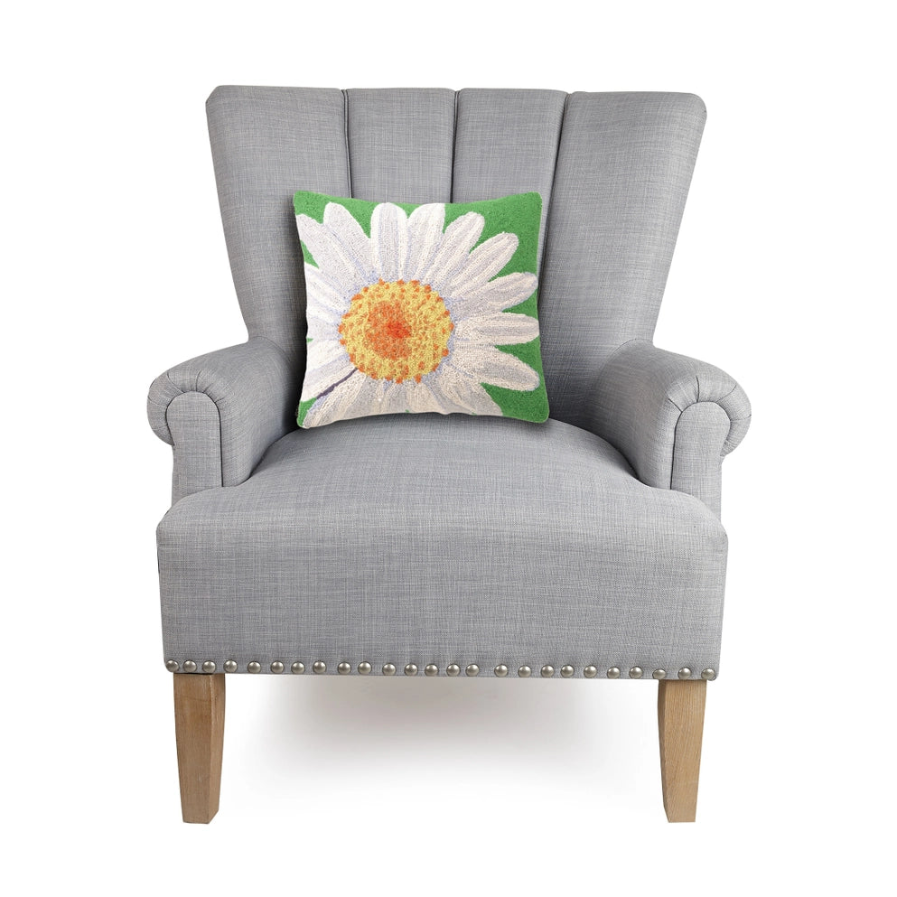 Bring the beauty of a blooming garden into your home with this vibrant 18" square daisy pillow. Featuring a hand-hooked wool face, the design captures the intricate details of a cheerful white daisy set against a green background. The solid polyester velvet back ensures a soft, luxurious feel, making this pillow as comfortable as it is eye-catching. Complete with a removable polyester insert and a convenient zipper closure, it’s easy to spot clean and maintain. Perfect for adding a pop of color and charm to your home.