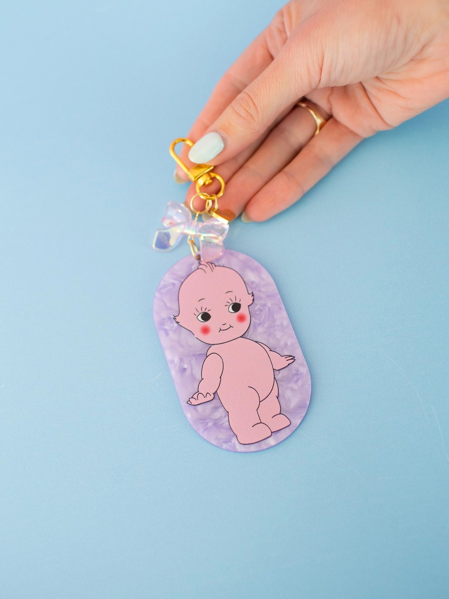 How cute is this lil bb kewpie!!! This keychain is made out of purple marbled acetate and printed with a kewpie on both sides.