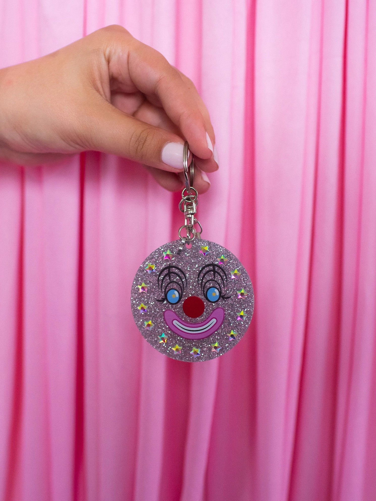 The perfect addition for the keys to your clown car! This acrylic glitter keychain features a smiling clown face surrounded by rhinestone stars! Comes with a silver, star-shaped, stay-closed clasp that's easy to add to your keyring without ruining your manicure.