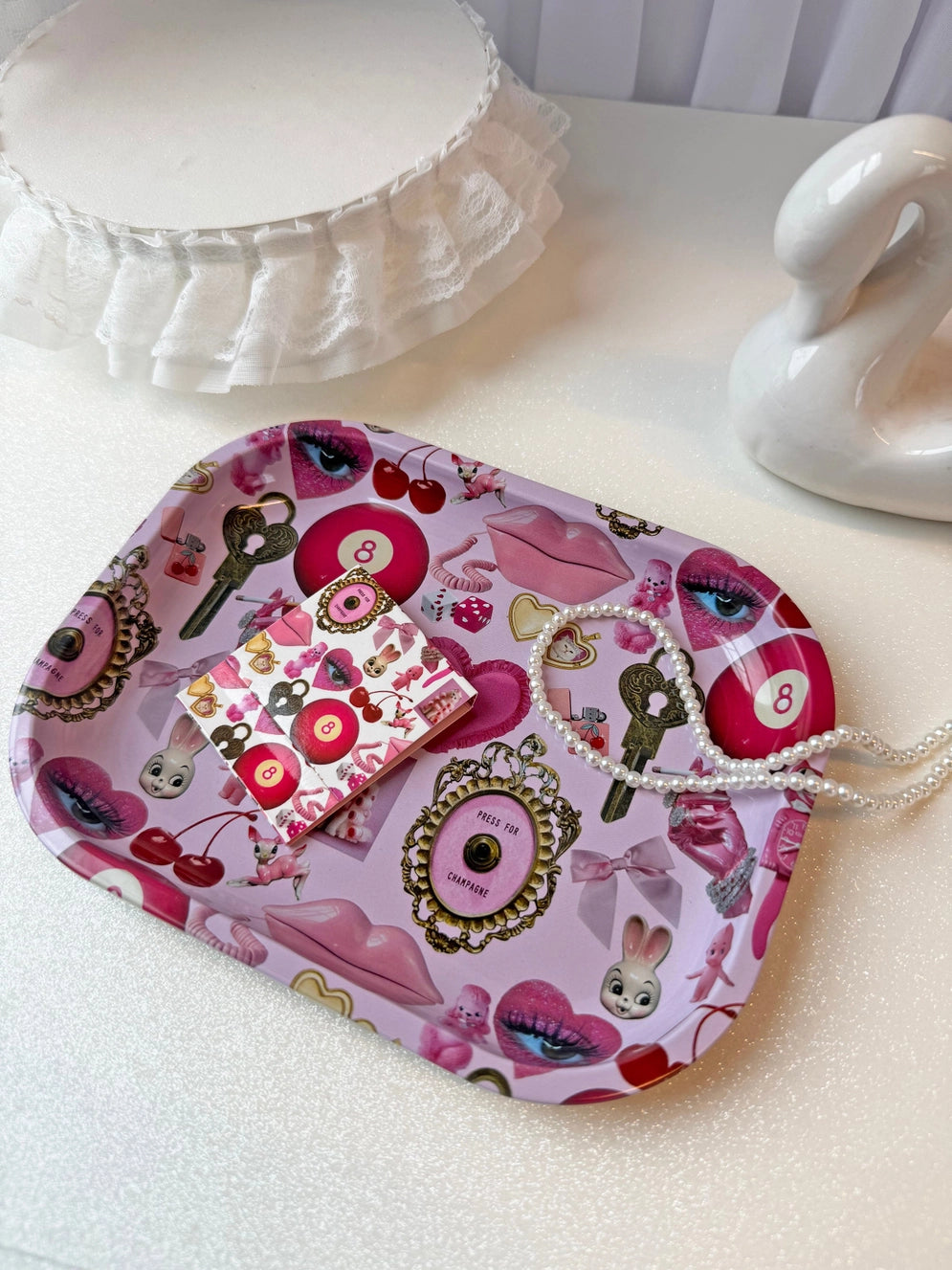 Pretty, pink, and ready to roll! Covered in gorgeous, gorgeous pink things, it features a collage of some of our favorite pink things, from hearts and bows to poodles and kewpie babies! This tray is perf for rolling or as a lil trinket tray around your home.